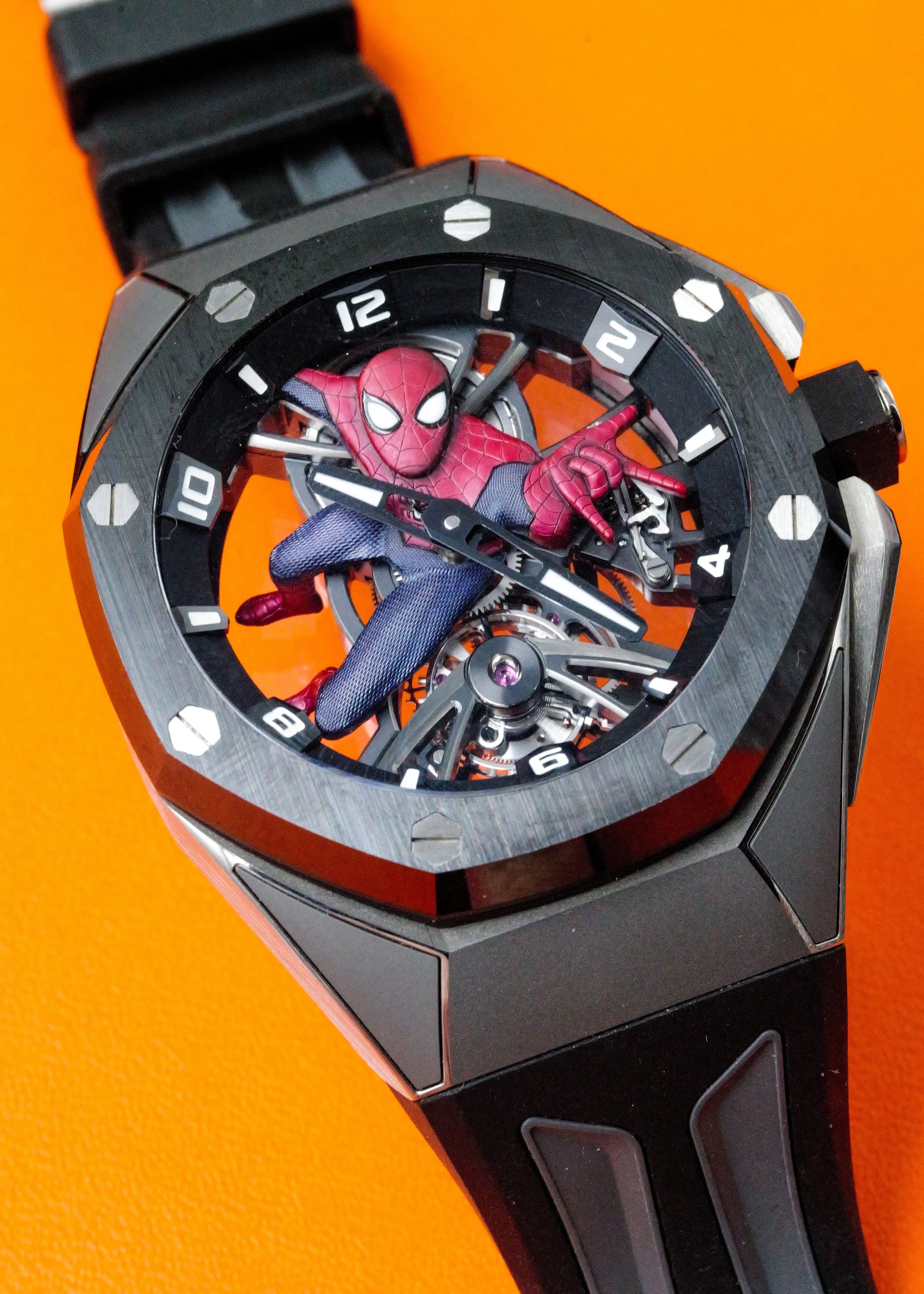 Audemars Piguet Royal Oak Concept Tourbillon 26631IO in stunning mint condition. This exclusive Spider-Man Marvel collaboration features the iconic superhero design on a skeletonized dial, showcasing the mesmerizing tourbillon mechanism. Limited to just 250 pieces worldwide, making this a highly sought collector's piece.